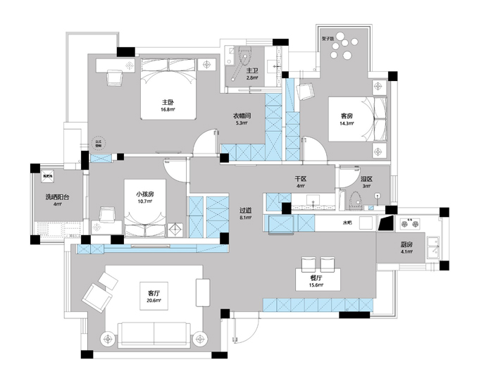 1.打掉北面陽臺納入到餐廳,把餐桌靠墻利用卡座的位置來節(jié)約空間,在餐廳處設計了西廚水吧區(qū),來延伸廚房的功能,這樣優(yōu)化后,各個空間的位置都可以互相利用。