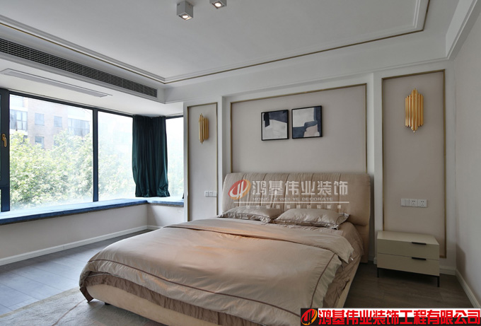 主臥室的頂也是原頂,四周吊了一個邊,鑲嵌了拉絲不銹鋼,床頭背景墻是石膏板做的,刷的實有色乳膠漆,邊是用了不銹鋼來收口。